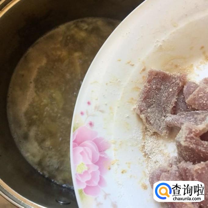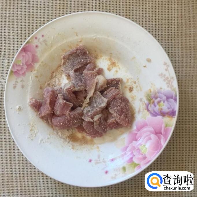 然后把瘦肉切成薄片并用适量的地瓜粉裹一下,如下图所示。