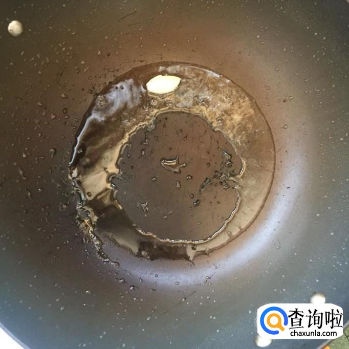 接着往锅中放入适量的食用油,待油冒烟丢进一个蒜头爆香,如下图所示。