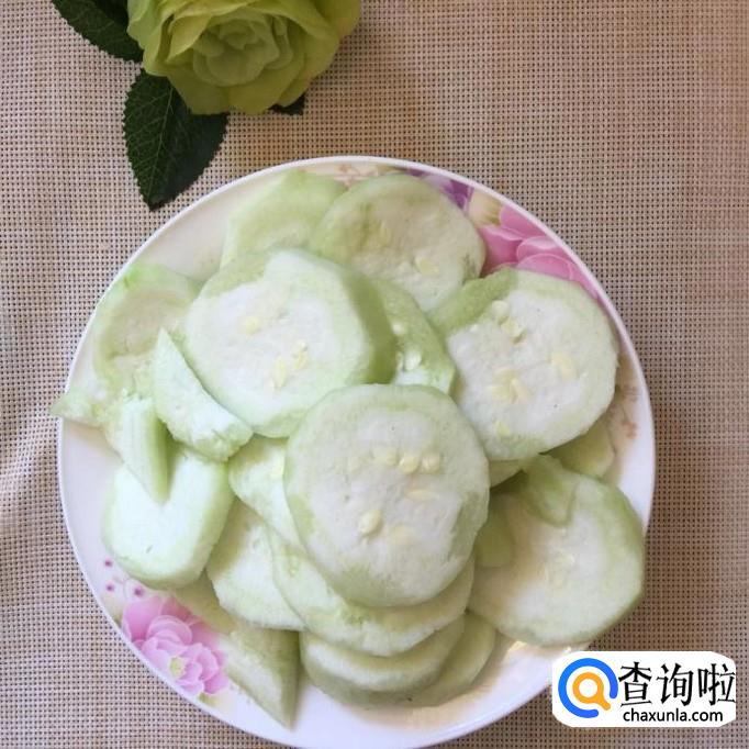 首先将丝瓜去皮切成宽约两毫米的片,如下图所示。