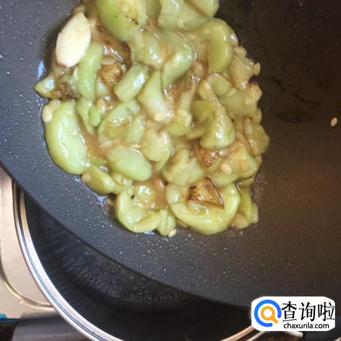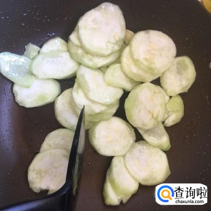 然后把切好的丝瓜倒入锅中翻炒三分钟,如下图所示。