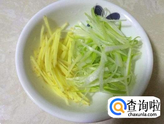 将葱姜切成丝,放在盘中备用,如图所示。
