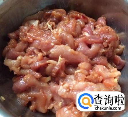 去超市购买一些新鲜的瘦肉,将其切成小块,然后腌制好,如图所示。