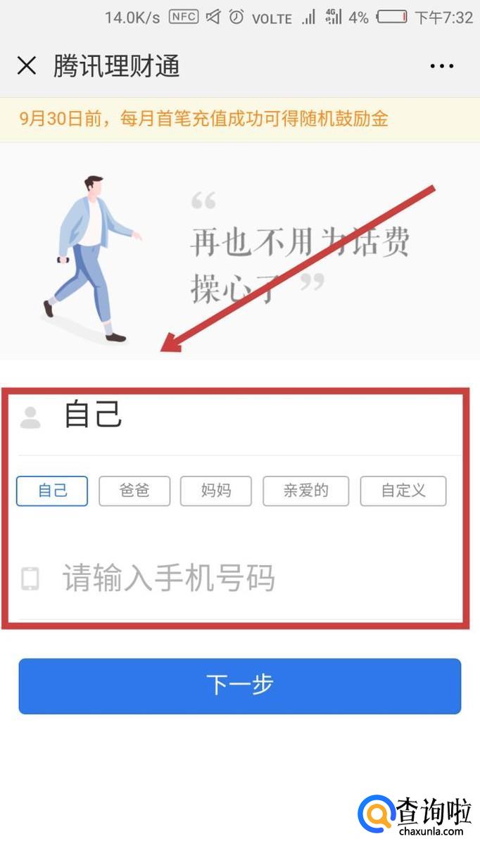 在这里输入手机号码和充值对象的昵称,再点击【下一步】。