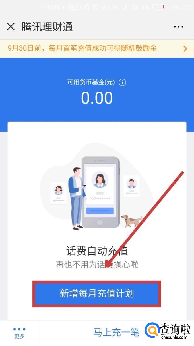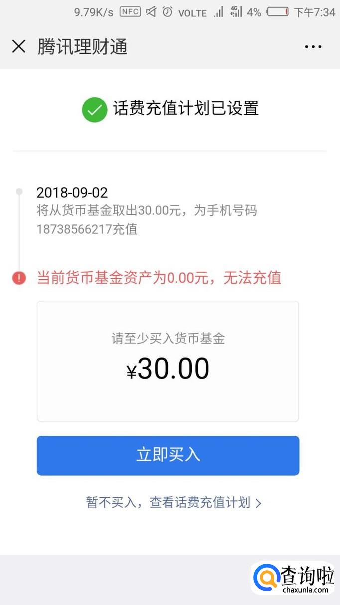 最后输入支付密码,这个话费充值计划就设置成功了。如果你还没有购买腾讯理财通的基金的话,点击下方的【立即买入】即可进行购买。