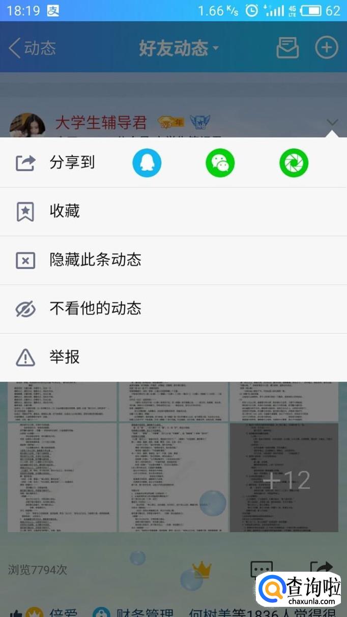 点击分享。在展开选项中点击想要到分享的位置,可以是QQ好友,空间,微信。
