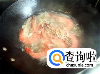 然后把虾放入锅中煮几分钟,虾不需要煮太长时间,因为虾肉鲜嫩很容易熟,看见虾皮变成红色就可以捞出来了。
