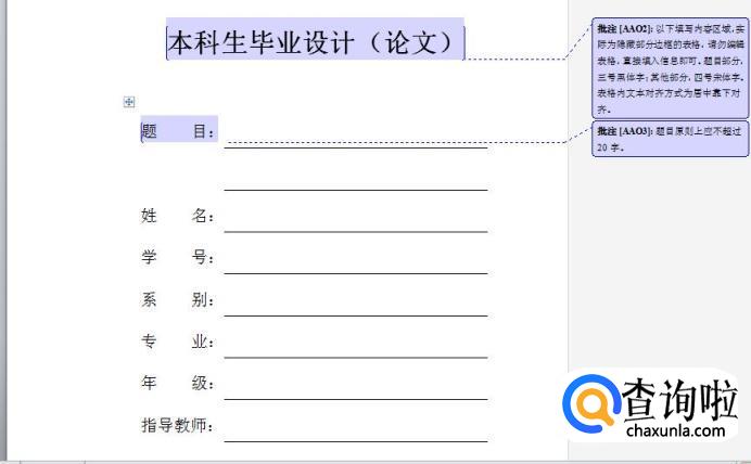 (3)姓名、学号、系别、专业、年级、指导老师:四号宋体字,表格内文本居中靠下对齐。
