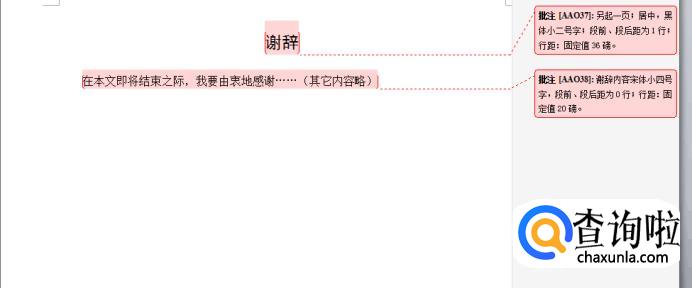 (1)谢辞:另起一页;居中,黑体小二号字;段前、段后距为1行;行距:固定值36磅。