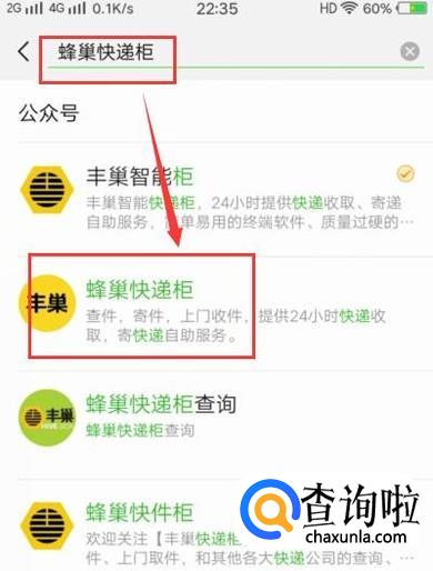 打开微信,点击右上角的“+”,然后点击“添加朋友”查找丰巢快递柜,关注该公众号,如图所示。