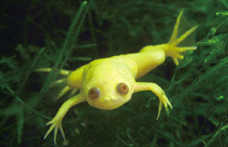 爪蟾 学名:Xenopus laevis ,“金蛙”实际上是它白化变色的商品名称。由于没有舌头只能利用其前肢搅食水中的无脊椎动物。 分布由南非的热带草原起,北至肯尼亚,乌干达西至喀麦隆。 体长100mm。雄性会比雌性小一截,后肢具有3对角质脚爪。 为完全水生种,广栖于淡水水域中,尤其喜好静止水域的环境。白天多潜藏于水底深处,夜晚则会爬至浅滩。初春至晚夏间为繁殖期,雌蛙每胎可产下2000颗以上的卵。