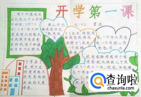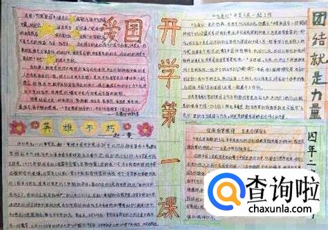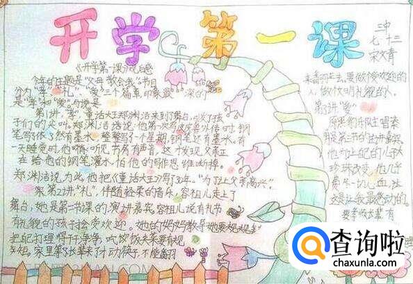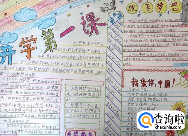 在左上角用彩笔写上“开学第一课”几个主题字,然后在左侧写下看完《开学第一课》的感想,可以加几句梦想格言和人生哲理。在右侧的区域写一些关于放飞梦想和热爱祖国的内容。