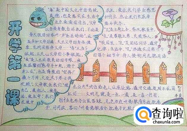 在画面下方画上草地和彩虹,用篱笆将文字部分分开,这样的“开学第一课”看上去充满生机和活力。