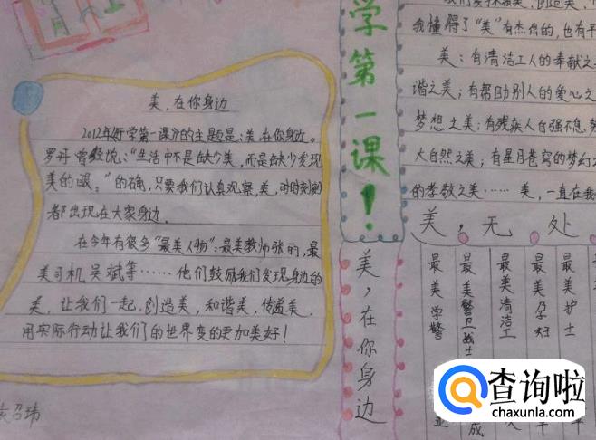 围绕“美,在你身边”这个主题写下相关内容,可以用彩色铅笔将重点内容框出来。