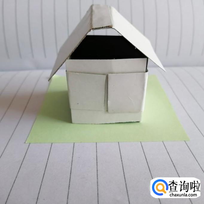 最后把房顶安在房子的主体上,就大功告成了。在下面再粘上一张草绿色小卡纸做房底。这样这个手工房子的简易做法就完工了。如图所示。