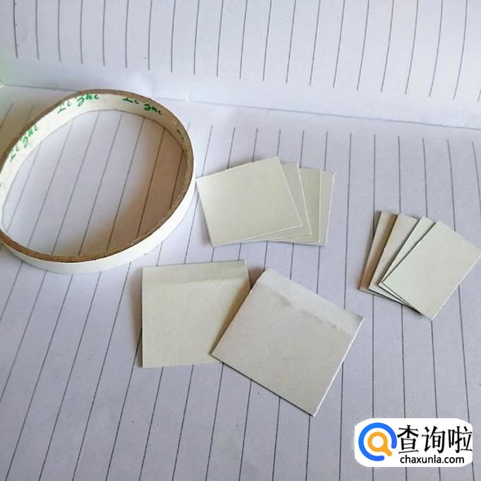 今天咱们只用到纸和双面胶来做手工房子。先把白色硬卡纸剪成六个正方体,四个长方体,如图所示。