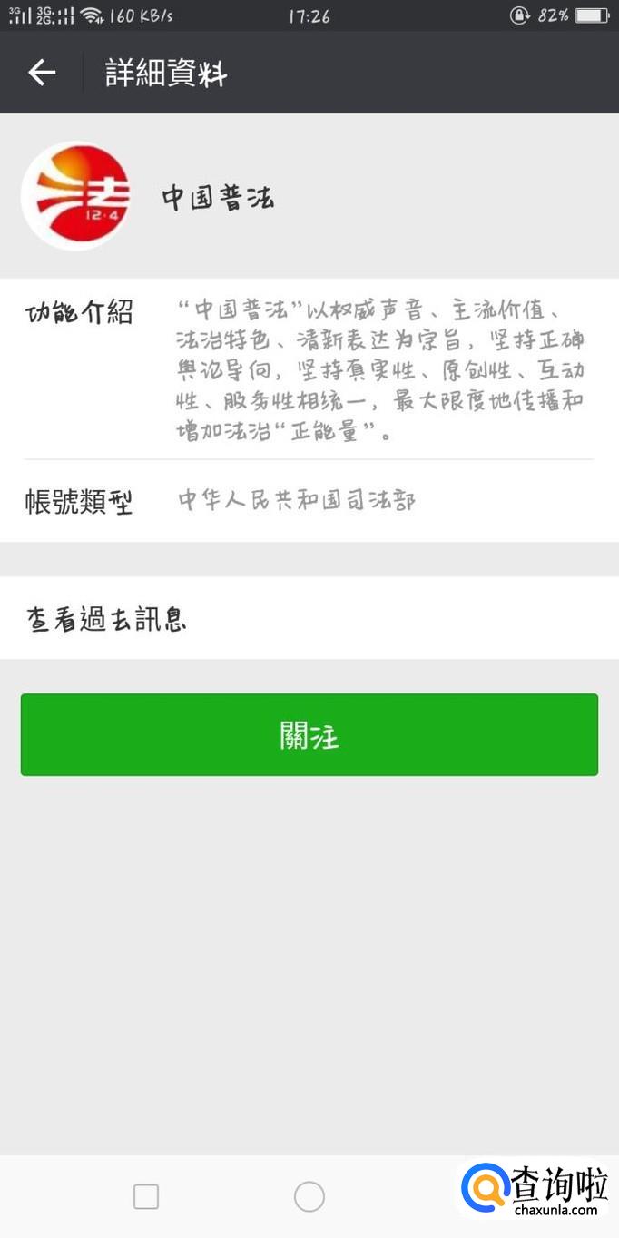 用微信查询,先打开你的微信并且登录,在公众号里输入“中国普法”,搜索出后点击关注。