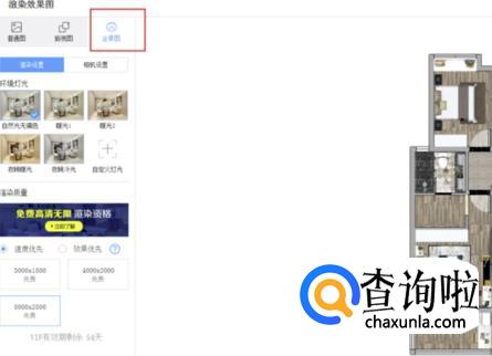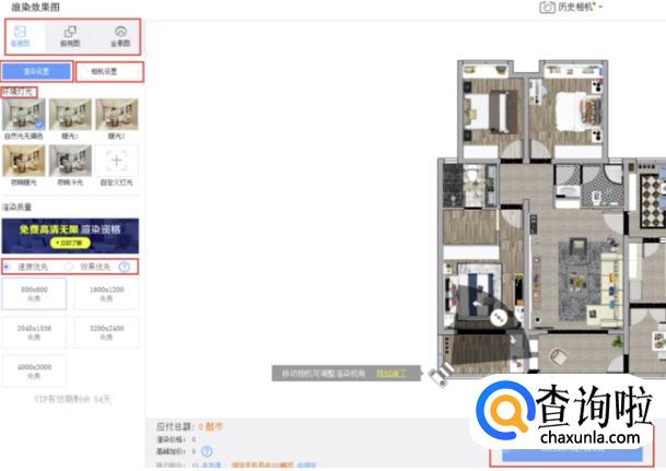 移动摄像机位置以选择角度,左边“渲染设置”可以设置环境灯光和渲染质量;点击“相机”选项可以设置相机参数,设置完成之后点击“渲染效果图”。也可以在速度优先和效果优先,选择想要的分辨率。选择渲染普通效果图、俯视图和全景图。