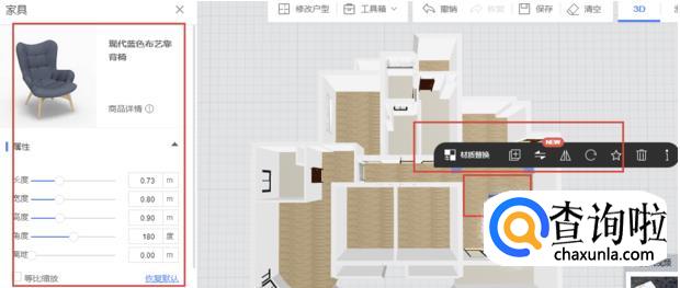 比如想在一个房间摆放一个椅子,选中素材库喜欢的椅子摆在喜欢的房子,接着可以看到左侧素材库中变成了椅子的样式,同样可以自己设置。椅子的位置,方向也是可以随时更改,如图所示。摆放家具时,建议采用“平面”视图,位置更准确!