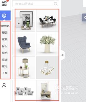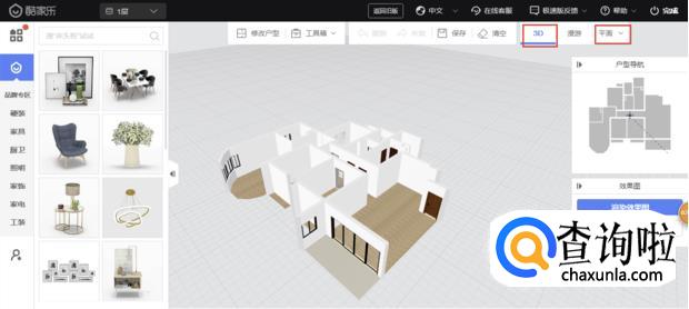 在完整的“3D”立体视图中,可以看到左侧素材库可以布置家具,灯饰等,可以根据自己喜欢的类型摆放在喜欢的位置。