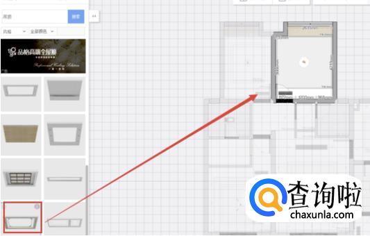 吊顶及吊灯——点击选择上方”顶面“视图,在左边素材库选择喜欢素材拖入房间内点击自动匹配按钮即可。tips:吊顶模型只适用于矩形房间,不规则房间可以自己设计吊顶—吊顶工具教程。