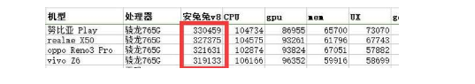 天玑800相当于骁龙765G搭载天玑800的OPPO A92s的安兔兔V8跑分:总分295798分稍微低于骁龙765G的32万分左右。跟麒麟820的38万分差距比较大。Geekbanch5的分数 :单核弱于骁龙765G、多核强于骁龙765G。但是输给麒麟820。