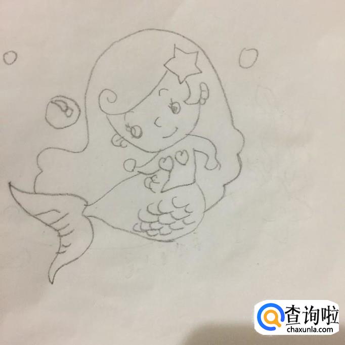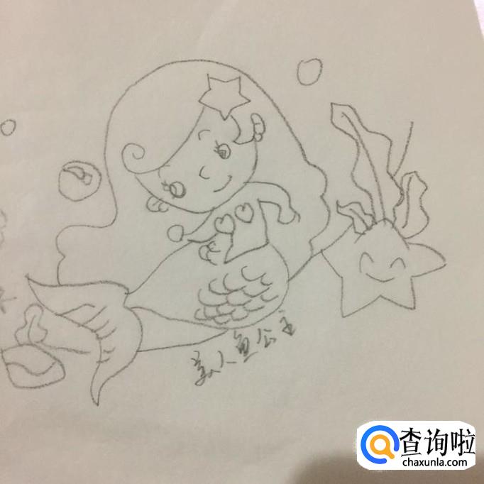 最后画出美人鱼公主旁边的星星和海藻还有贝壳等。这样一幅美人鱼公主就画好了,希望大家能够喜欢。