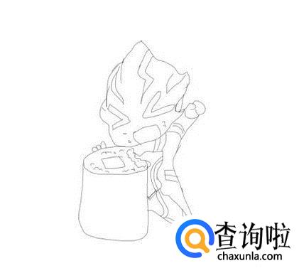 在头部和食物的基础上再画出梦比优斯奥特曼的身体及腿部,然后再画出梦比优斯奥特曼的胳膊及手部,这样梦比优斯奥特曼就画好了,如图所示: