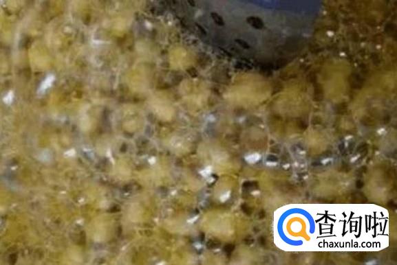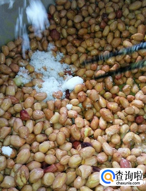糖液熬好之后准备下花生米,用漏勺均匀的搅拌花生米,防止花生米黏锅,放点食用盐