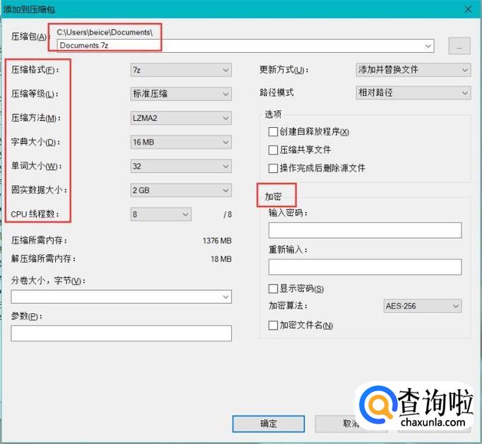 然后在“添加到压缩包”对话框中可以对压缩包进行设置,如压缩包名称、存放路径、格式、加密等,设置完成后点击确定。