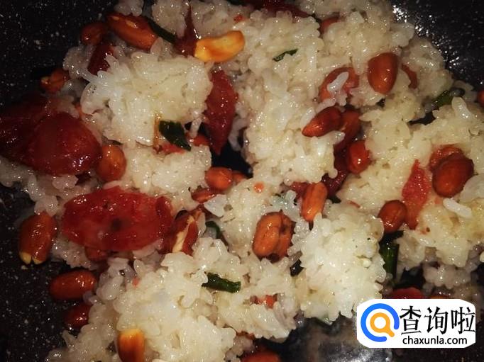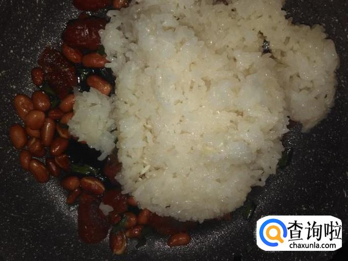 然后放煮熟的糯米饭进去翻炒均匀就可以食用了。
