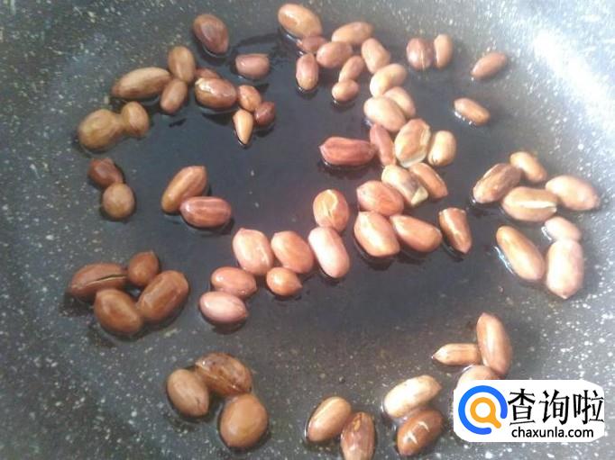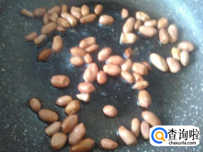 开火放适量的油,然后放花生进去炸炒至脆香为止,再撒适量的盐进去翻炒均匀。