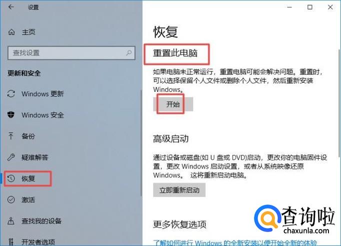 弹出的界面,我们点击恢复,然后我们点击重置此电脑下方的开始;