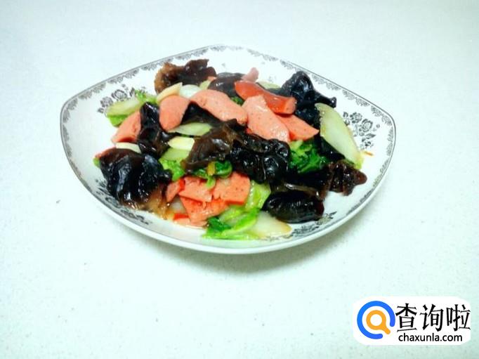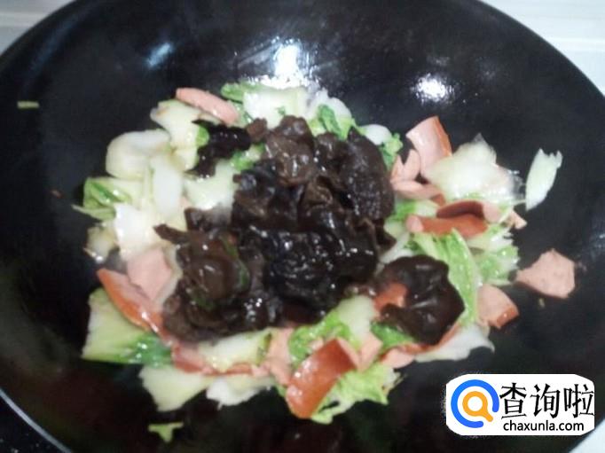 脆皮肠 4根,木耳 适量,大白菜 200克。