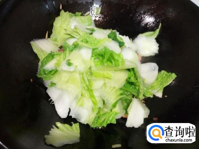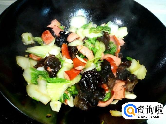 白菜片炒至六分熟,放入木耳翻炒,放入盐,蒜。