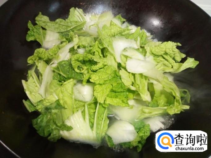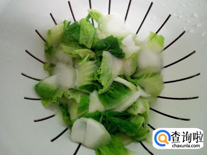 把白菜片用水焯一下,水开后入锅10秒钟捞出,迅速用冷水过凉,沥干水分。