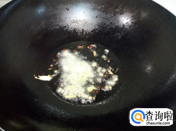 锅里放入油加热,油热后放入花椒,葱,姜,爆锅。放入脆皮肠小火翻炒,放入料酒。