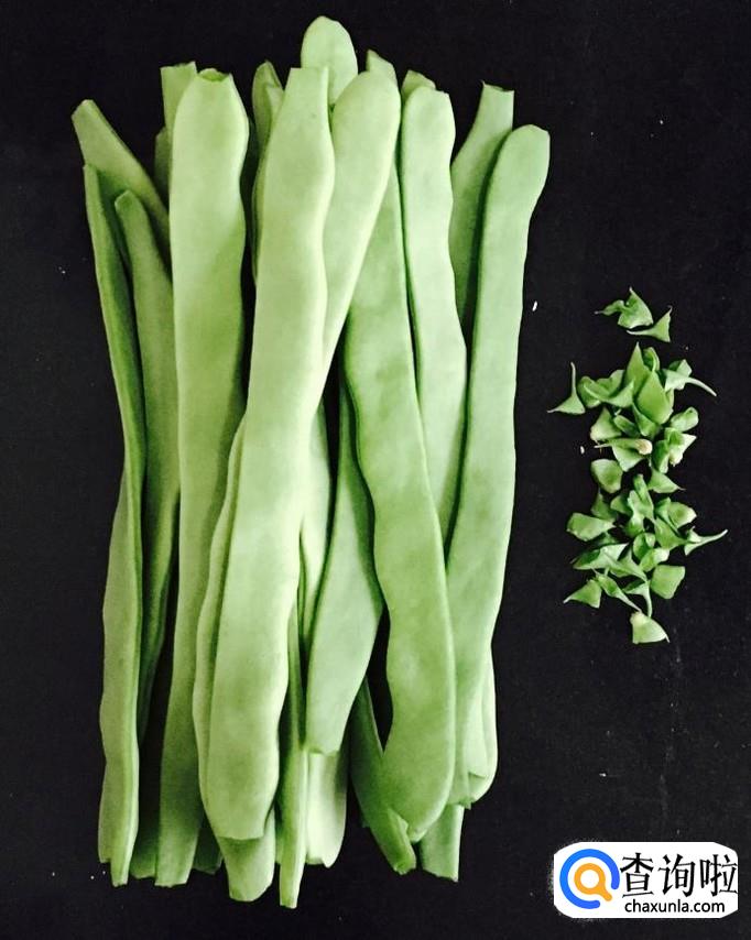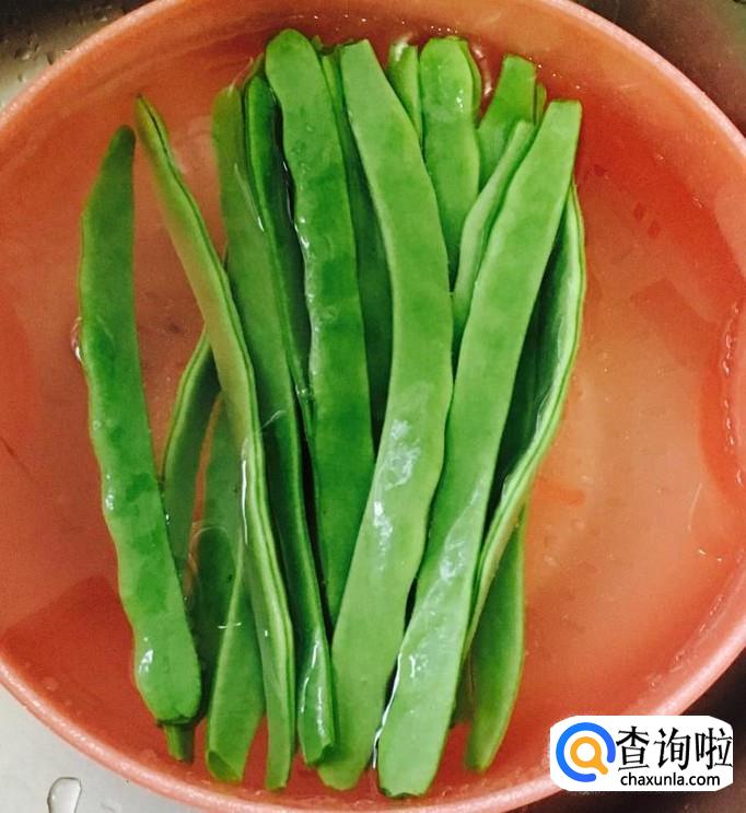 豆角择去两头清洗干净,放入容器中用清水浸泡一下,然后控干水分切成小段