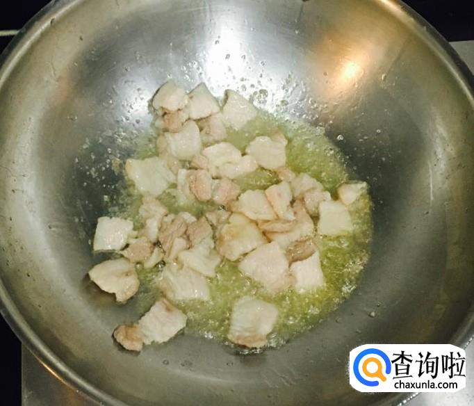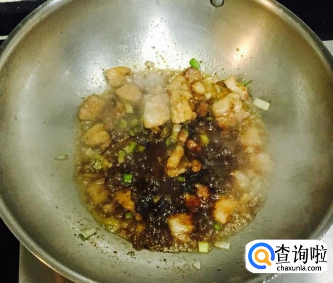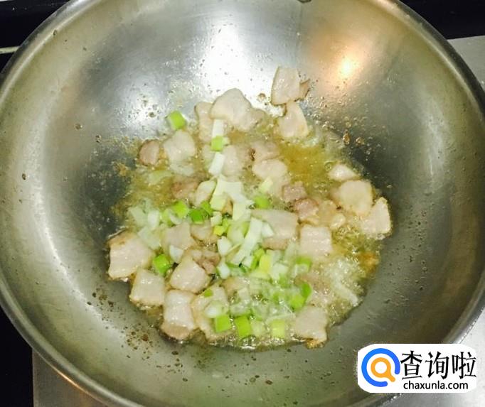热锅加入适量的花生油把五花肉炒出香味,放入葱花爆香,料酒、生抽烹锅