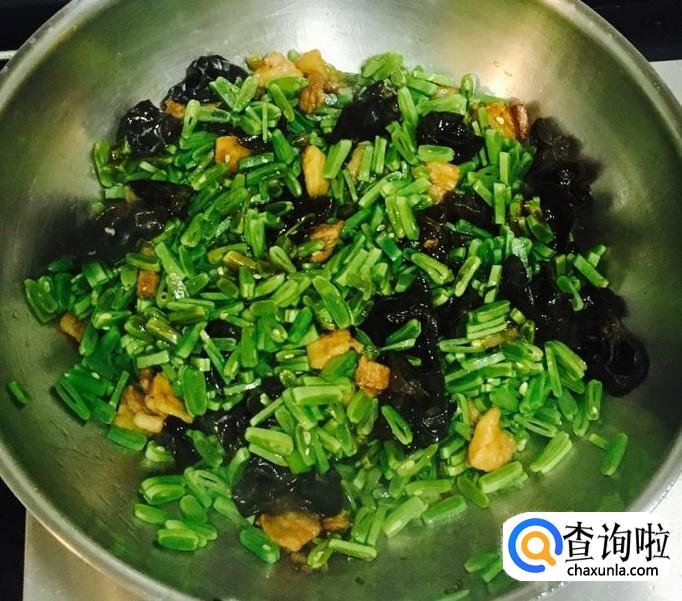 豆角,木耳,鸡蛋,五花肉,葱,韭菜,花生油,盐,蚝油,料酒,生抽,水等等