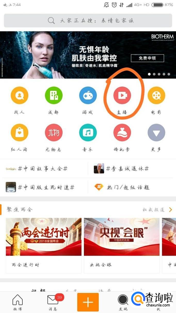 进入“发现”页面后,点击页面中间的“直播”,如下图所示