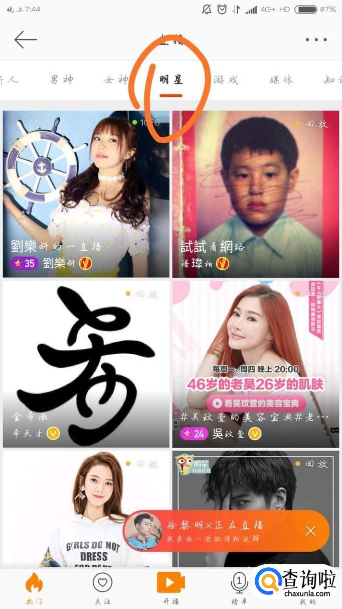 直播里面在选项条左滑动,直到出现“明星”然后选择点击它