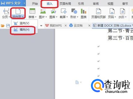 点击“插入”,然后在工具栏中选择“空白页”,“横向”。