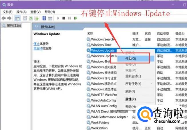 最后在服务列表中找到Windows Update服务,右键单击选择停止即可,如下图所示