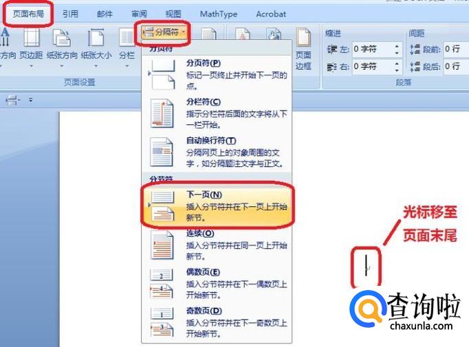 光标移到目录页的末尾,如图所示,点击“页面布局”,点击“分隔符”按钮,选择插入“下一页分节符”。