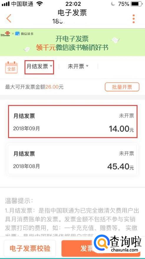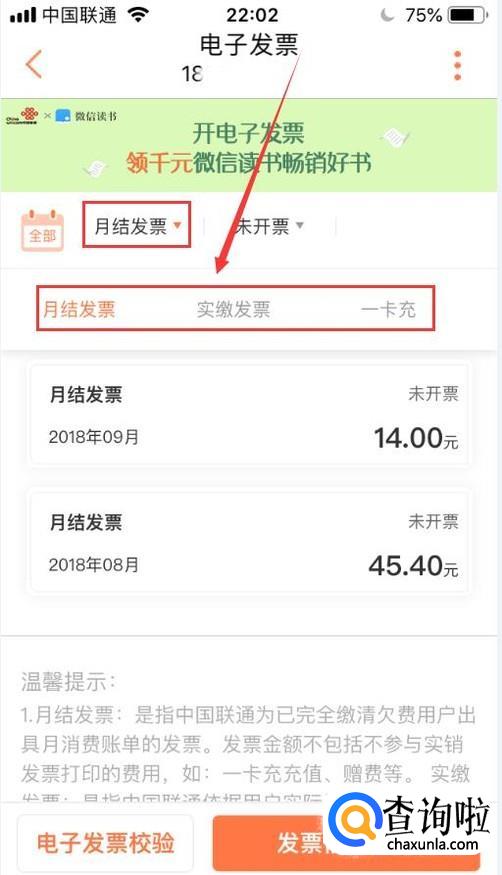 在“电子发票”界面我们能选择“月结发票”、“实缴发票”或“一卡充”,如图,这里选择的是“月结发票”,点击进入未开票的月结发票。