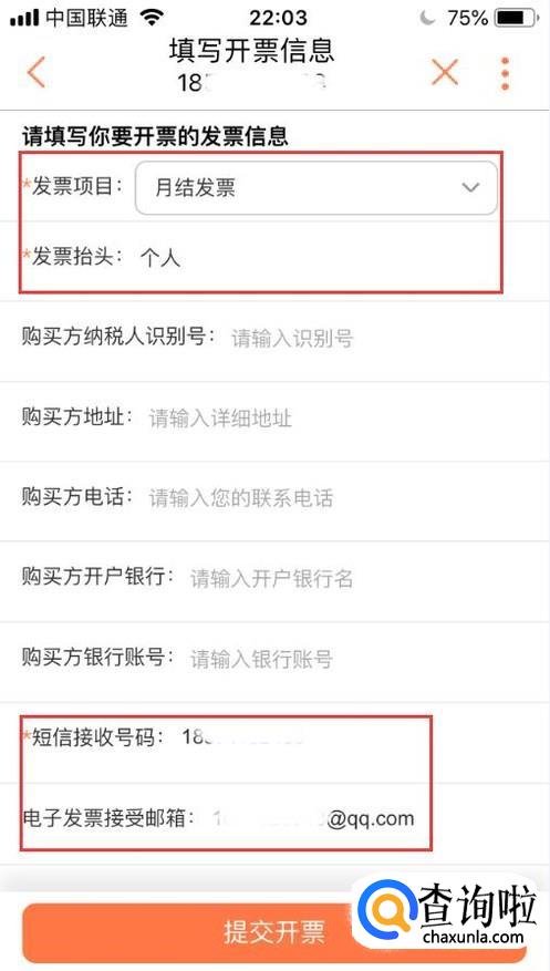 在“填写开票信息”界面输入必填内容,其他选填内容为选填,然后点击底部的“提交开票”。注:这里建议大家填写电子发票接收邮箱,方便接收电子发票。