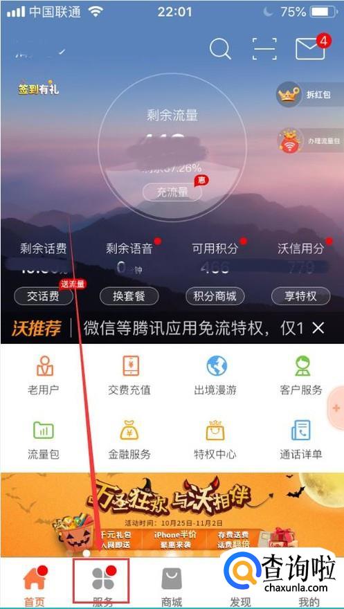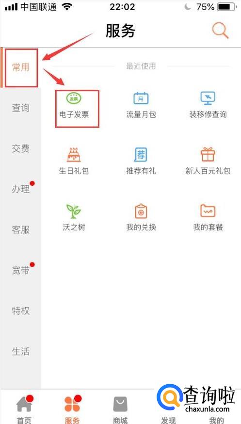 在手机中打开联通营业厅,点击底部的“服务”,然后找到“电子发票”。