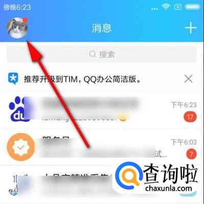 手机上登录QQ,进入到消息页面。在消息页面左上角点击自己的头像。