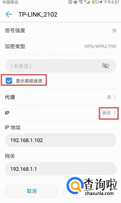 之后我们点击勾选上显示高级选项,之后我们点击IP后面静态的地方;