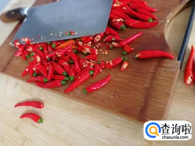 将小米辣剁碎。如果辣椒比较多,可以用专门绞辣椒的机器绞碎。